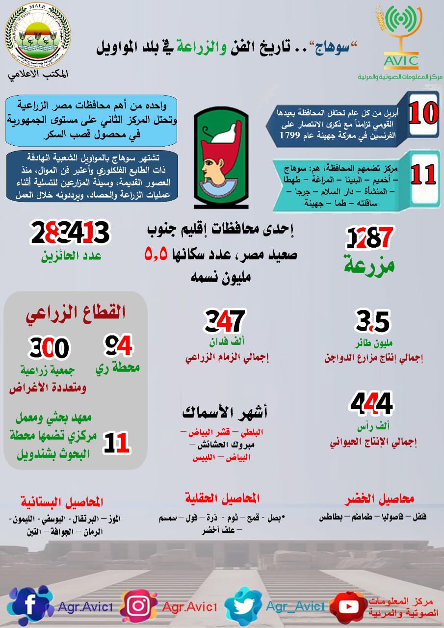 نشر مركز المعلومات الصوتية والمرئية بوزارة الزراعة واستصلاح الأراضي، انفوجراف بمناسبة العيد القومي لمحافظة سوهاج بعنوان: سوهاج.. تاريخ الفن والزراعة في بلد المواويل.