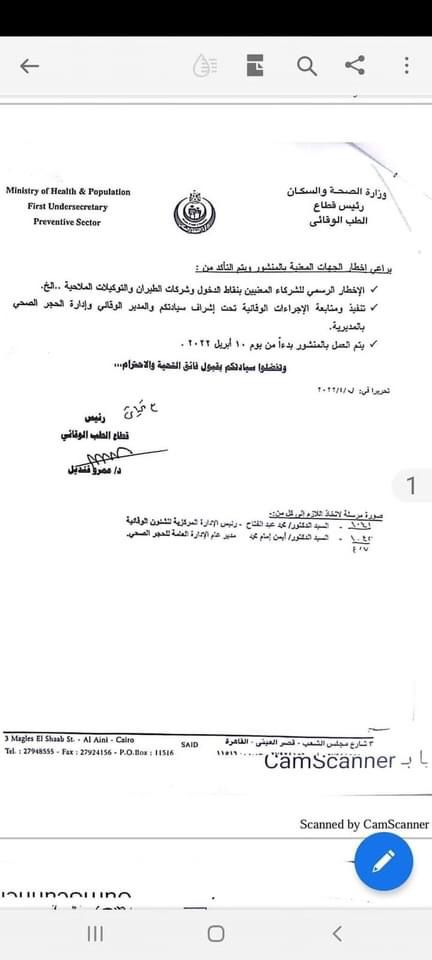 وتضمن المنشور، ضرورة قيام الحجر الصحي بالمطار بالتنسيق مع شركات الطيران نحو تشجيع القادمين من الخارج على التسجيل على المنصة الإلكترونية عبر رابط https.Visitegypt.com والحصول على كود الموافقة للدخول إلى مصر QR Code.