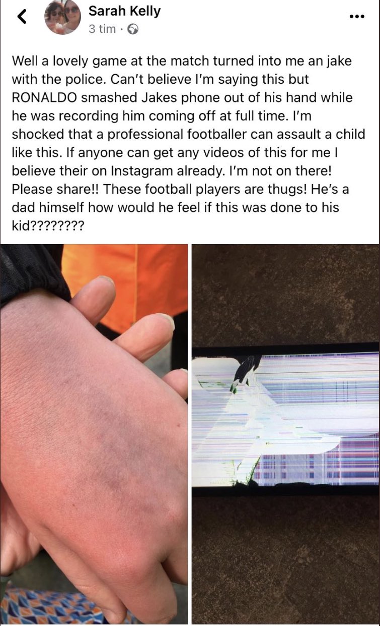وعلقت والدة مشجه إيفرتون عبر حسابها الرسمي على موقع التواصل الاجتماعي "فيسبوك"، قائلة: حسنًا، لقد تحولت لعبة جميلة في المباراة إلى مهزلة مع الشرطة، لا أصدق أنني أقول هذا لكن كريستيانو رونالدو حطم هاتف نجلي من يده بينما كان يلتقط له الصور.