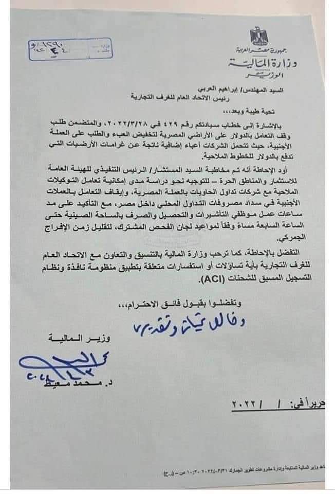 وقال خطاب موجه من الدكتور محمد معيط، وزير المالية إلى المهندس إبراهيم العربي، رئيس الإتحاد العام للغرف التجارية والغرفة التجارية بالقاهرة؛ إنه بموجب المقترح المقدم من الاتحاد فإنه سيتم إيقاف التعامل بالعملة الأجنبية وسيتم التعامل بالنقد المحلي لتقليل الضغط على العملة الأجنبية وسداد مصروفات التداول المحلي والتأكيد على مد ساعات العمل لموظفي التأشيرات والتحصيل والصرف بالساحة الصينية حتى السابعة مساءا وفقا لمواعيد لجان الفحص المشترك وتقليل زمن الإفراج الجمركي.