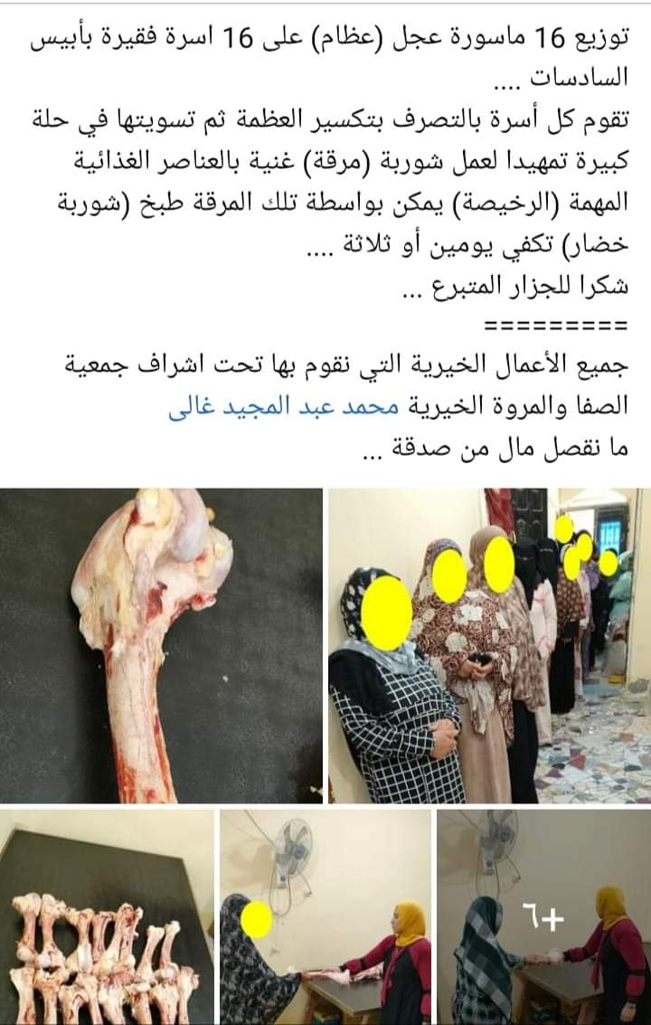 ووفقا للمنشور المتداول مع تلك الصور؛ فإن الجمعية الخيرية وزعت تلك العظام على 16 أسرة من سكان قرية أبيس.