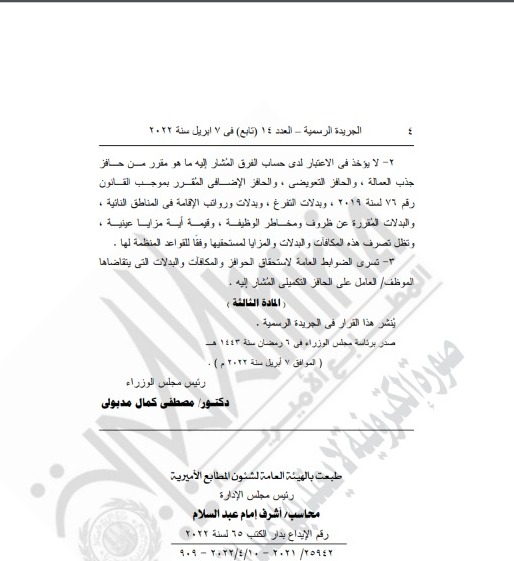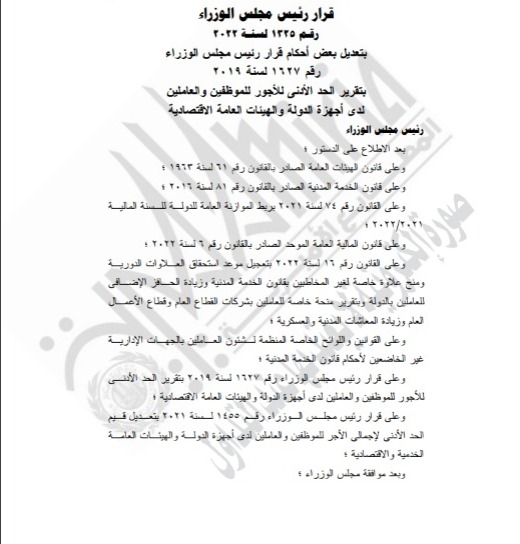 نشرت الجريدة الرسمية في عددها الصادر اليوم الأحد، قرار رئيس مجلس الوزراء رقم 1325 لسنة 2022 بتعديل بعض أحكام قرار رئيس مجلس الوزراء رقم 1627 لسنة 2019 بتقرير الحد الأدنى للأجور للموظفين والعاملين لدى أجهزة الدولة والهيئات العامة الاقتصادية.