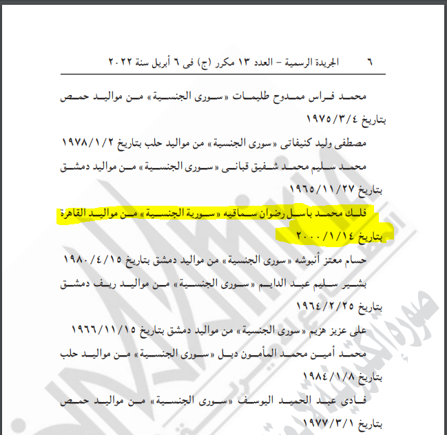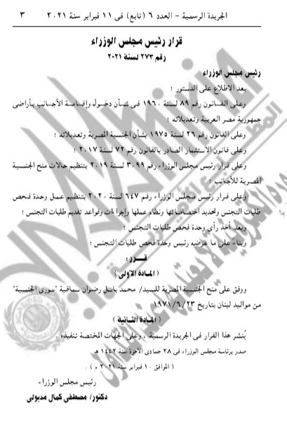 وتضمن القرار منح الجنسية لـ فلك محمد باسل رضوان سماقية، من مواليد القاهرة بتاريخ 14 يناير 2002 ابنة المستثمر السوري ورجل الأعمال محمد باسل رضوان سماقية مالك شركة قطونيل.