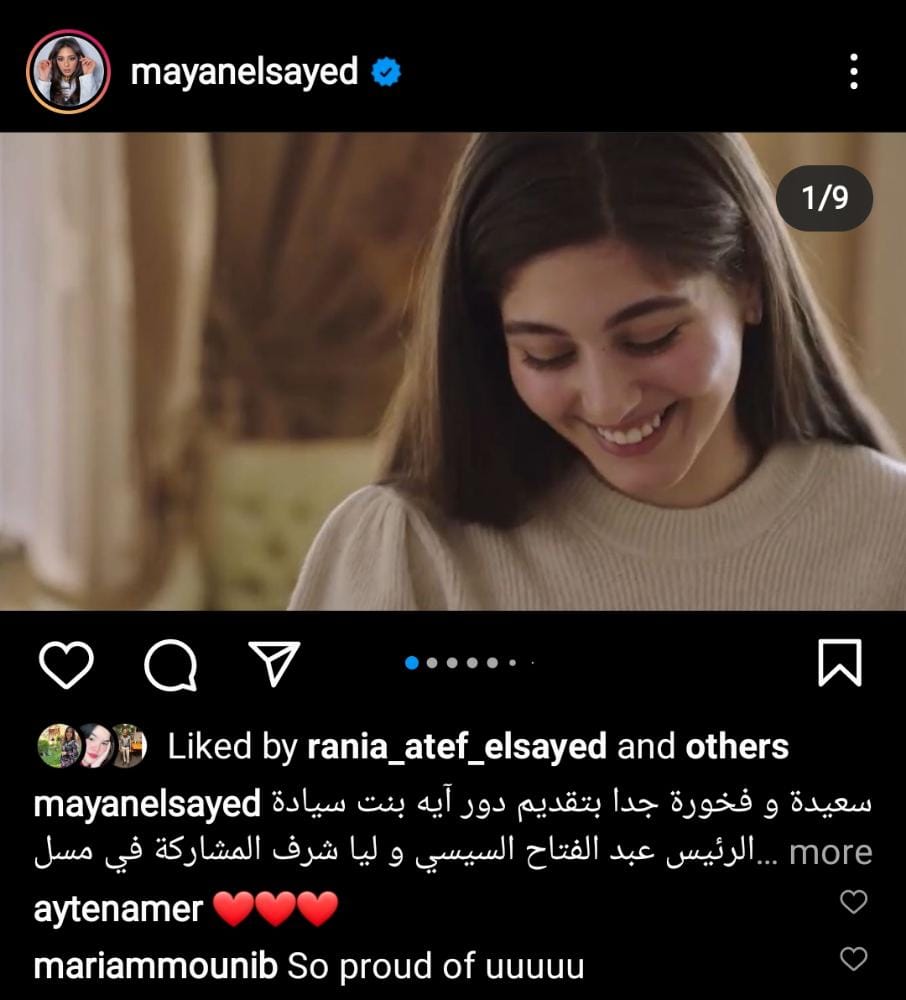 ونشرت الفنانة مايان السيد عبر انستجرام صور من دورها في مسلسل الاختيار 3، وعلقت على الصور قائلة: سعيدة وفخورة جدًا بتقديم دور آية بنت سيادة الرئيس عبد الفتاح السيسي، وليا شرف المشاركة في مسلسل كبير وضخم زي مسلسل الاختيار3.