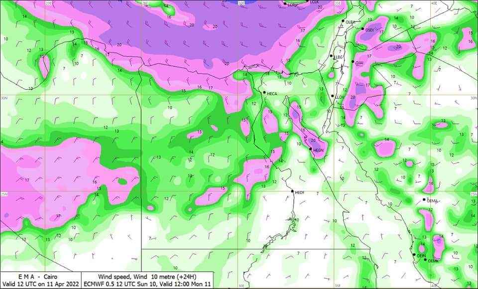 وفقا للنشرة الجوية لهيئة الأرصاد المصرية أن تنشط رياح على مناطق من القاهرة الكبرى والوجه البحري والسواحل الشمالية يوم السبت المقبل الموافق 16 أبريل، قد تكون مثيرة للرمال والأتربة على مناطق أقصى غرب البلاد.