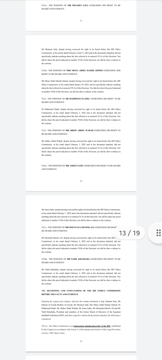 أولا: حرمان مجلس إدارة هشام نصر من ممارسة أي نشاط متعلق بكرة اليد على المستوى المحلي والقاري والدولي لمدة عام، من تاريخ 6 أبريل 2022.