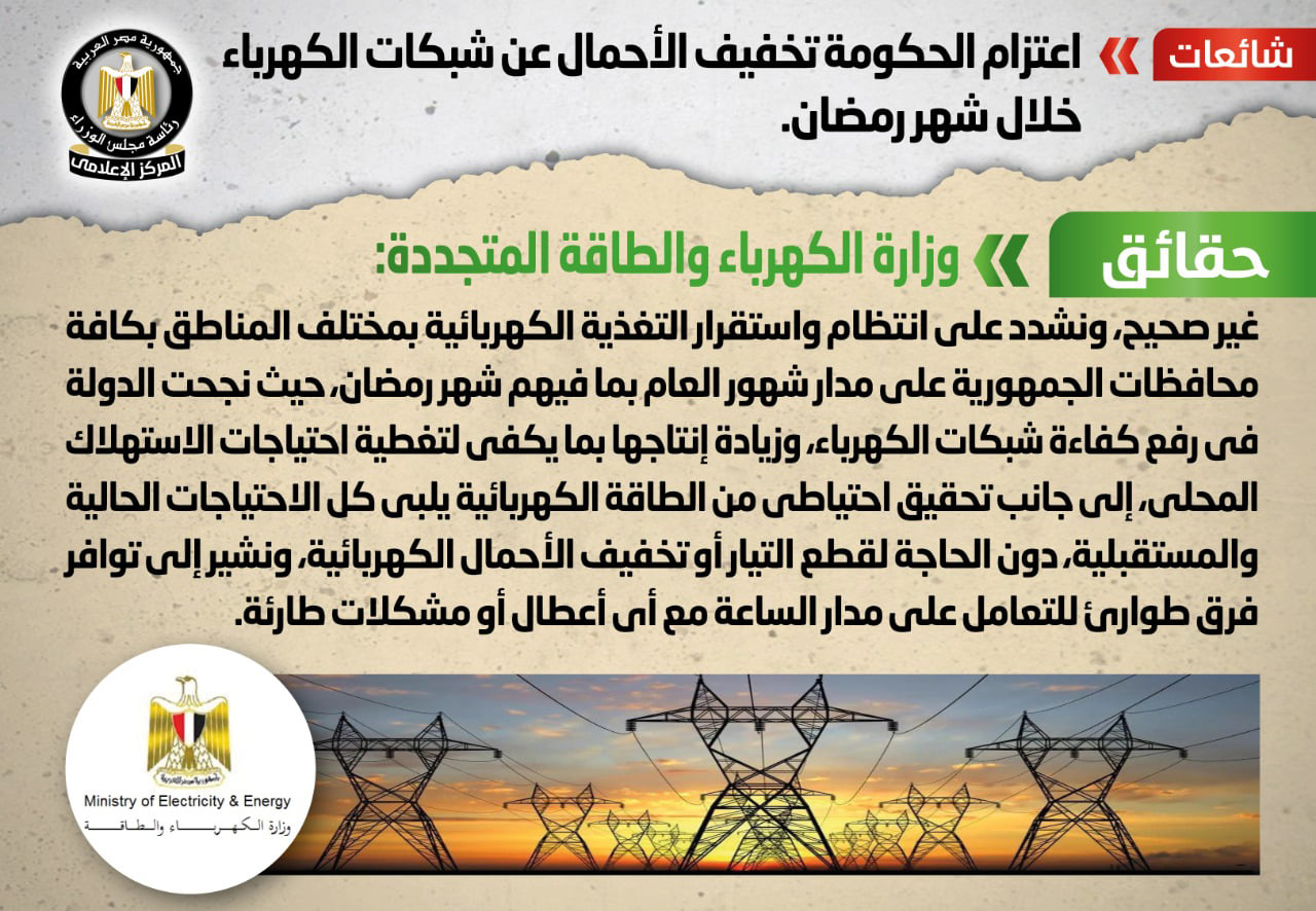 وتواصل المركز الإعلامي لـمجلس الوزراء، مع وزارة الكهرباء والطاقة المتجددة، وأكدت أنه لا صحة لتخفيف الأحمال عن شبكات الكهرباء خلال شهر رمضان، مُشددةً على انتظام واستقرار التغذية الكهربائية بمختلف المناطق بكافة محافظات الجمهورية، على مدار شهور العام بما فيها شهر رمضان، حيث نجحت الدولة في رفع كفاءة شبكات الكهرباء، وزيادة إنتاجها بما يكفي لتغطية احتياجات الاستهلاك المحلي، إلى جانب تحقيق احتياطي من الطاقة الكهربائية يلبي كل الاحتياجات الحالية والمستقبلية، دون الحاجة لقطع التيار أو تخفيف الأحمال الكهربائية، مُشيرةً إلى توافر فرق طوارئ للتعامل على مدار الساعة مع أي أعطال أو مشكلات طارئة.