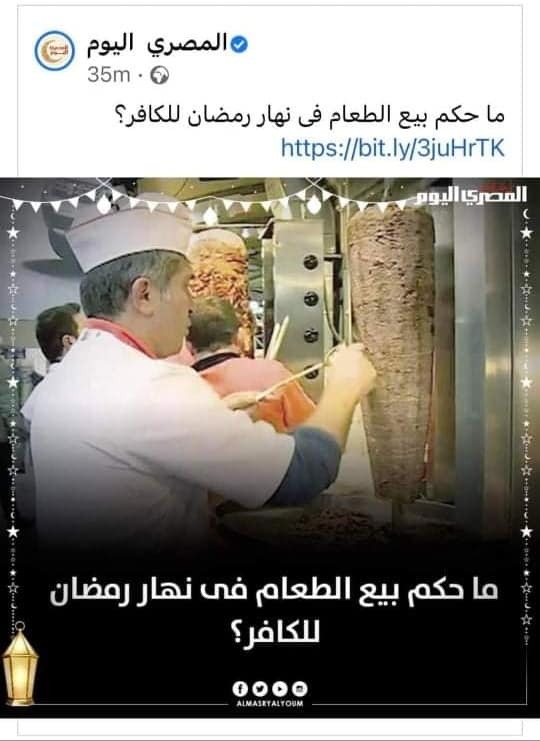 نشرت مؤسسة المصري اليوم، اليوم الثلاثاء، اعتذارًا عن الخبر الذي نشرته صباح اليوم في عددها الورقي وعلى موقها الإلكتروني وحمل عنوان ما حكم بيع الطعام في نهار رمضان للكافر؟، كما أعلت منذ قليل أن المؤسسة اتخذت قرارًا بإيقاف المسؤول عن نشر الفتوى المثيرة للجدل.