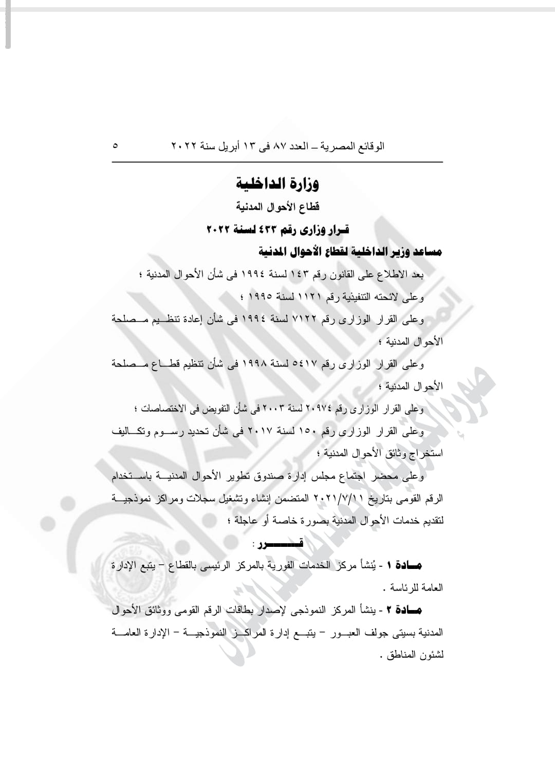 نشرت الجريدة الرسمية صباح اليوم الأربعاء، قرارات وزارة الداخلية بإنشاء مركز نموذجي لإصدار بطاقات الرقم القومي ووثائق الأحوال المدنية بسيتى جولف العبـور ويتبـع إدارة المراكـز النموذجيـة والإدارة العامـة وذلك طبقًا للقانون رقم 433 لسنة 2022 الصادر بشأن إعادة تنظيم مصلحة الأحوال المدنية.