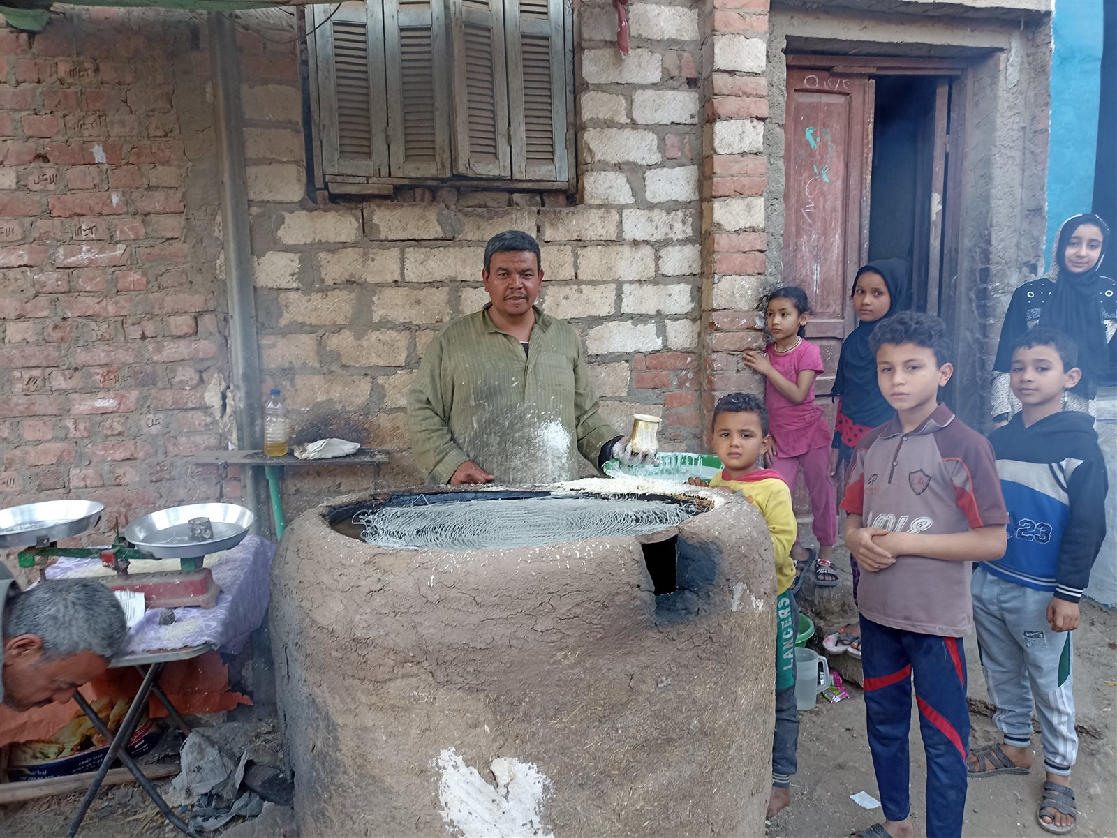 «الفرن ده عمره أكتر من 40 سنة»، هكذا تابع عرفات حديثه، فقال: إنه يبدأ عمله سنويا مع حلول شهر رمضان الكريم، متخذا من ناصية منزله شادرا صغيرا يقف فيه مع شقيقه وزوجاتهم لإعداد الكنافة يدويا باستخدام الفرن البلدى الذى ورثه عن والده مثلما ورث منهم أصول وتعاليم المهنة، مشيرا إلى أنه يقوم ببناء الفرن قبل عدة أيام من قدوم شهر رمضان مثبتا عليه صينية الصاج الدائرية التى تفوح منها رائحة أجداده ووالده،وتجهيز القش والبوص، لإشعال الفرن البلدي، ويظل يصنع من خلال فرنه الكنافة البلدى طوال شهر رمضان الكريم، إلى أن تحل وقفة العيد، فيستمر في العمل علي فرن الكنافه باقي الشهور يومي الإثنين والخميس من كل أسبوع، ليواصل عمله فى مهنة يعشقها ويفرح من خلالها جميع أهالى وأبناء قريته.