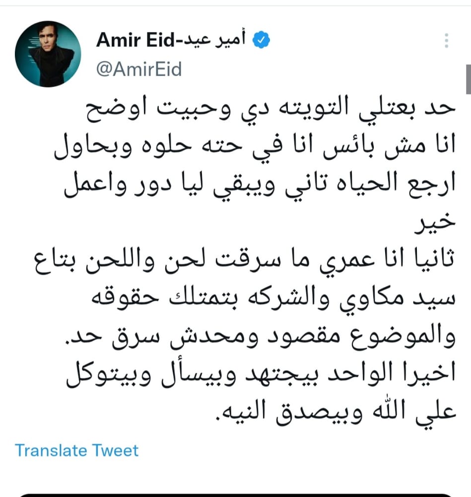 وتابع أمير عيد: ثانيًا أنا عمري ما سرقت لحن، واللحن بتاع سيد المكاوي، والشركة بتمتلك حقوقه والموضوع مقصود محدش سرق حد، وأخيرًا الواحد بيجتهد، وبيسأل وبيتوكل على الله وبيصدق النيه.