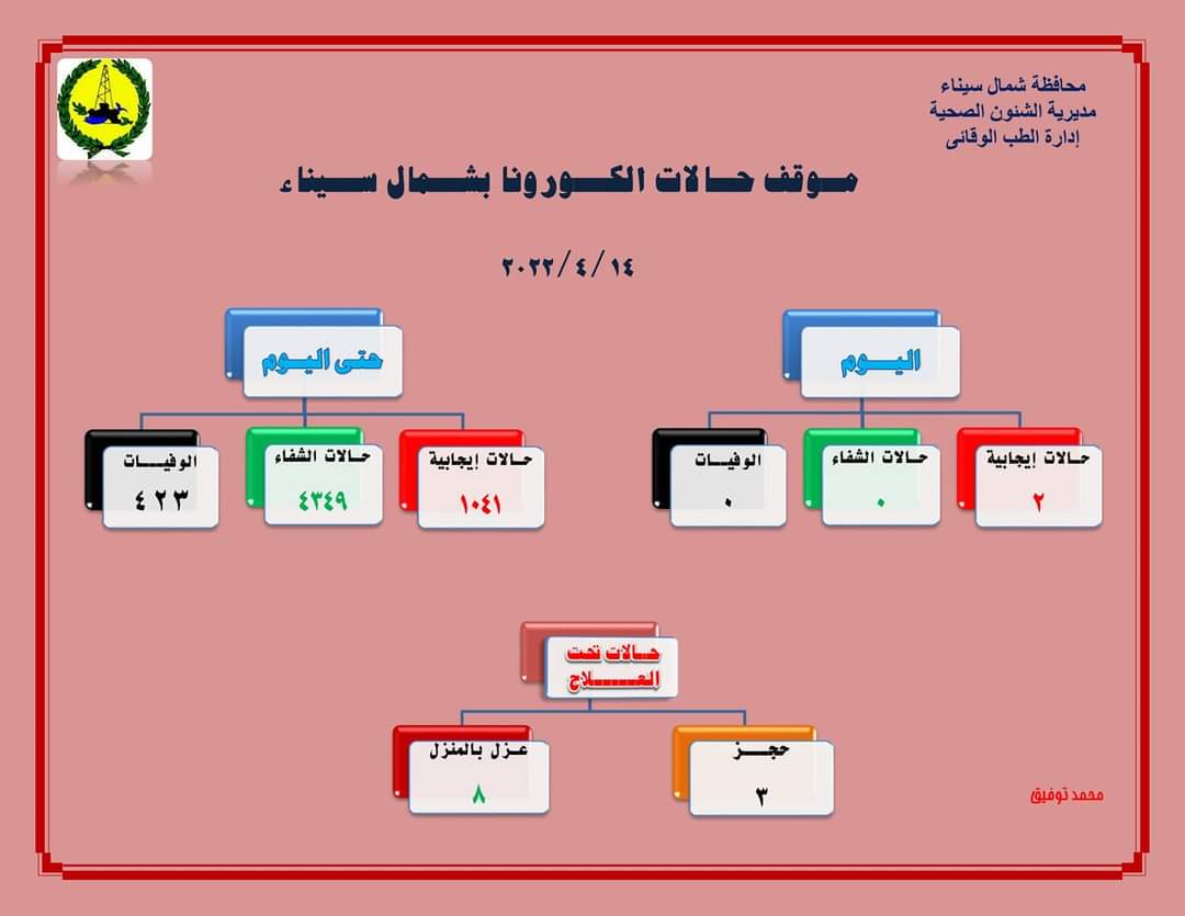 أعلنت مديرية الصحة بمحافظة شمال سيناء، تسجيل حالتي إصابة بفيروس كورونا المستجد وصفر وفيات.
