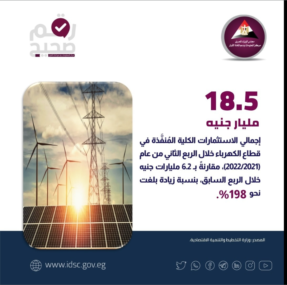 نشر مركز المعلومات ودعم اتخاذ القرار التابع لمجلس الوزراء، انفوجراف، سلط الضوء من خلاله، على ارتفاع قيمة الاستثمارات المُنفَّذة في قطاع الكهرباء خلال الربع الثاني من عام 2022/2021، لتصل إلى 18.5 مليار جنيه، بنسبة زيادة بلغت 198%.