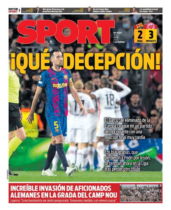تصدر العنوان، يا لها من خيبة امل، غلاف صحيفة سبورت لعدد اليوم، حيث قالت أنه تم إقصاء برشلونة من الدوري الأوروبي في مباراة مخيبة للآمال برد فعل نهائي متأخر للغاية.