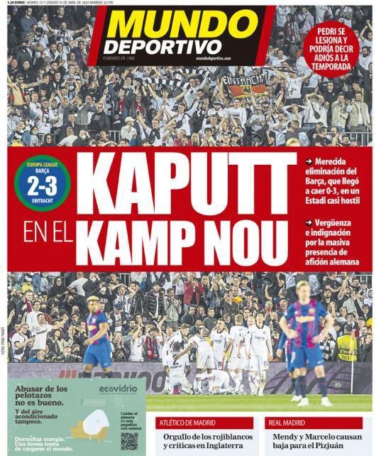 شنت صحيفة موندو ديبورتيفو هجومًا قاسيًا على فريق برشلونة وجماهيره التي تركت تذاكرها، حيث عنونت في غلافها بـ برشلونة استحق الإقصاء.. إنه عار بعد الحضور الهائل للجماهير الألمانية.