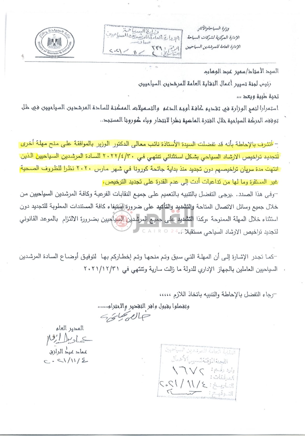 وناشد المدير العام، بالتنبيه بالتعميم على جميع النقابات الفرعية وكافة المرشدين السياحيين من خلال جميع وسائل الاتصال المتاحة والتشديد والتأكيد على ضرورة استيفاء كافة المستندات المطوبة للتجديد دون استثناء خلال المهلة الممنوحة، وكذا التشديد على جميع المرشدين السياحيين بضرورة الالتزام بالموعد القانوني التجديد تراخيص الارشاد السياحي مستقبلا.