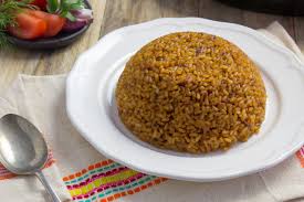 المكونات: بصلة كبيرة مفروم، كيلو أرز مغسول أو حسب الرغبة، معلقتين كبار من صلصة الطماطم، وزيت، و2 معلقة كاتشب أو رشة سكر حسب الرغبة، ملعقة صغيرة كمون، 3 أكواب من المياه المغلي أو حسب الرغبة، جوزة الطيب، ملح، كرفس.