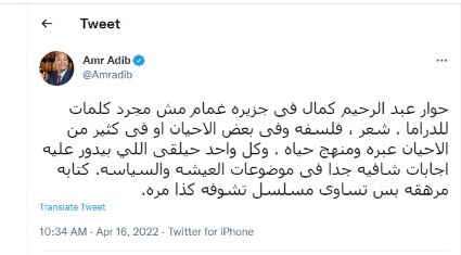 وعبّر عمرو أديب عن رأيه من خلال حسابه على تويتر، حيث كتب: حوار عبد الرحيم كمال في جزيرة غمام مش مجرد كلمات للدراما، شعر، فلسفة، وفي بعض الأحيان أو في كثير من الأحيان عبرة ومنهج حياة، وكل واحد هيلقى اللي بيدور عليه، إجابات شافية جدًا في موضوعات العيشة والسياسة، كتابة مرهقة بس تساوي مسلسل تشوفه كذا مرة.
