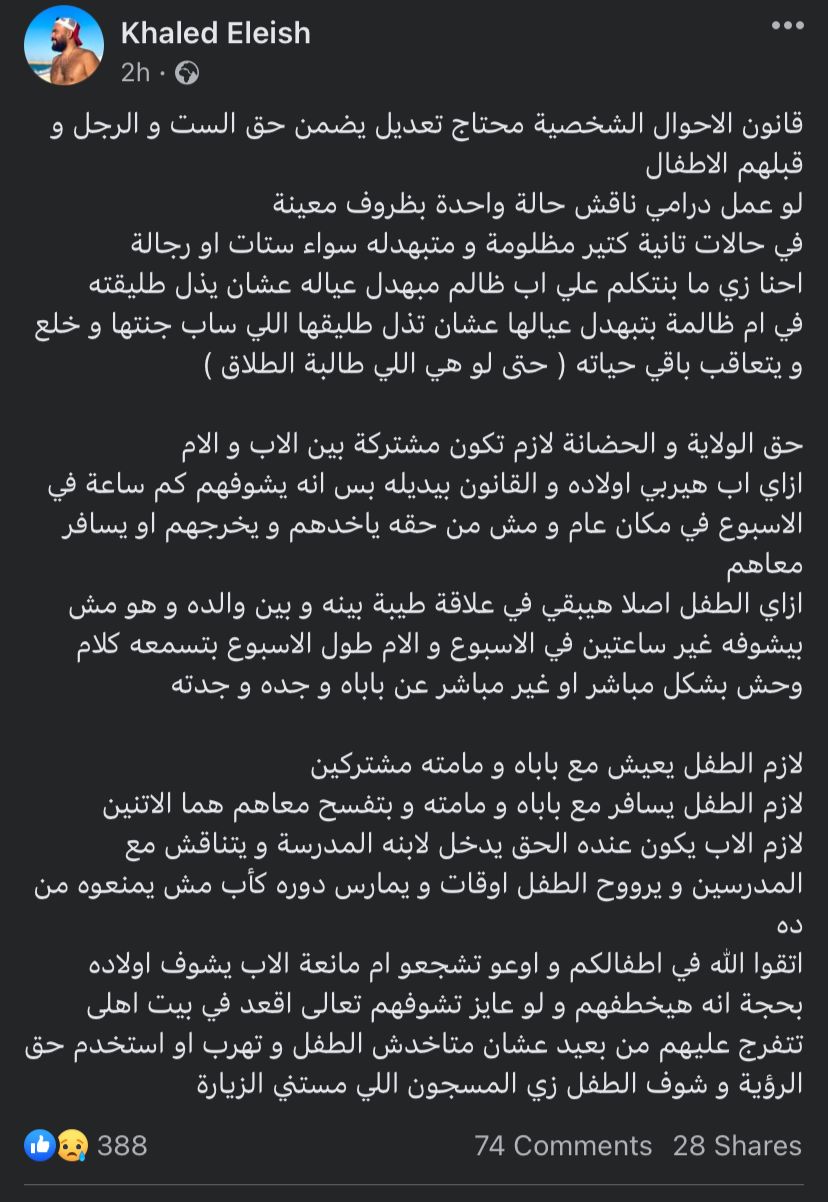 وكتب خالد عليش، منشورًا عبر حسابه الشخصي بموقع التواصل الاجتماعي فيسبوك، وقال: قانون الأحوال الشخصية محتاج تعديل يضمن حق الست والرجل وقبلهم الأطفال، لو عمل درامي ناقش حالة واحدة بظروف معينة، في حالات تانية كتير مظلومة ومتبهدلة سواء ستات أو رجالة، احنا زي ما بنتكلم على أب ظالم مبهدل عياله عشان يذل طليقته، في أم ظالمة بتبهدل عيالها عشان تذل طليقها اللي ساب جنتها وخلع ويتعاقب باقي حياته حتى لو هي اللي طالبة الطلاق.
