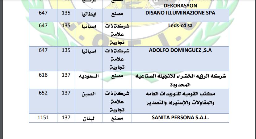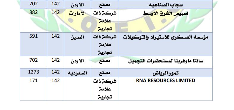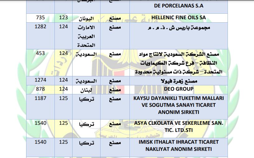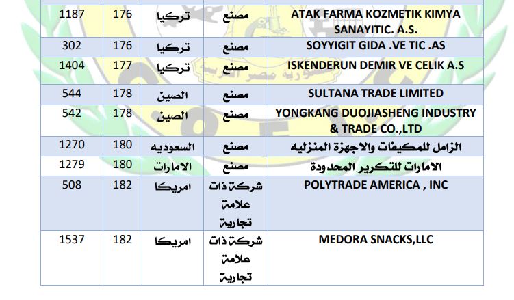 وكذلك ضمت القائمة، مصنع مكة للأواني المنزلية السعودي في رقم قرار وزاري 295، ومصنع نخيل الوطن في رقم قرار وزاري 43، والشركة الوطنية للتنمية الزراعية نادك، ومؤسسة بسام عبد الرازق وعظ الدين في رقم قرار وزاري 73، والمصنع السعودي للعطور ومستحضرات التجميل المحدودة في رقم 816.