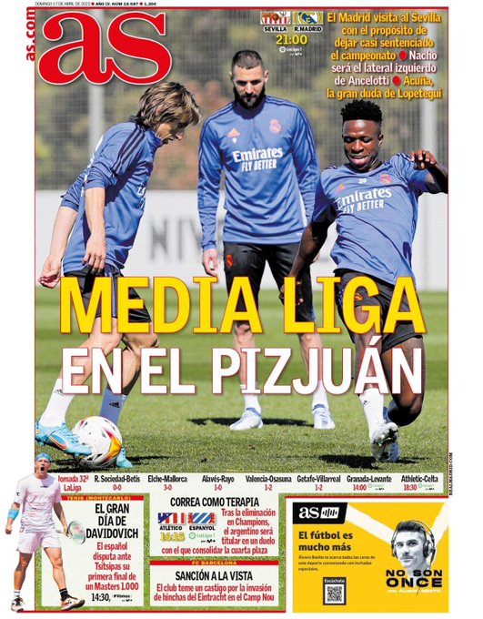 عنونت آس في غلافها اليوم بـ نصف الدوري في بيزخوان، حيث قالت إن ريال مدريد يزور إشبيلية بهدف الفوز من أجل البطولة التي كاد أن يسيطر عليها.