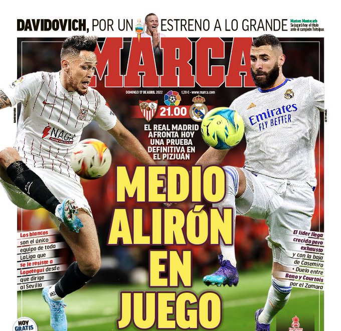 قالت ماركا في غلافها، نصف الجناح على المحك، حيث أوضحت أن ريال مدريد المتصدر يصل لمواجهة إشبيلية اليوم مع قليل من الإرهاق وبغياب كاسميرو الموقوف.