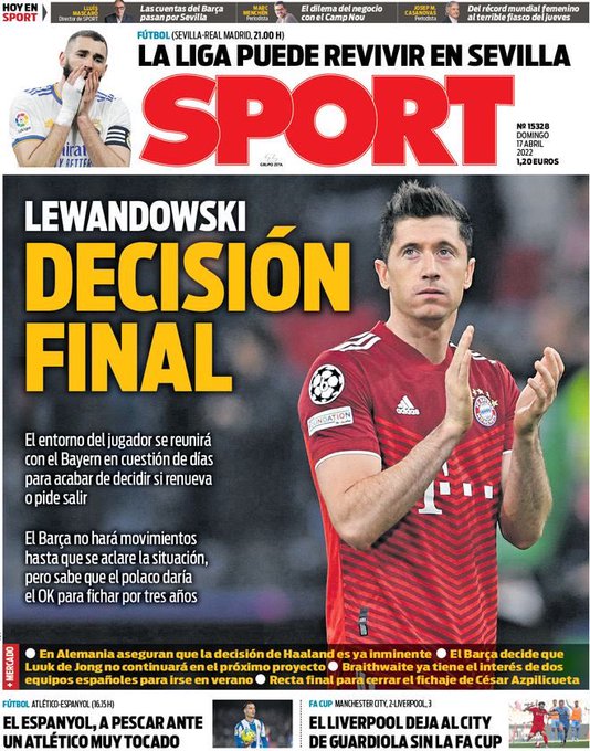 عنونت سبورت في غلافها بـ ليفاندوفسكي: القرار النهائي، حيث قالت إن حاشية اللاعب سوف تلتقي بايرن في غضون أيام للانتهاء من اتخاذ قرار بشأن التجديد أو طلب المغادرة.