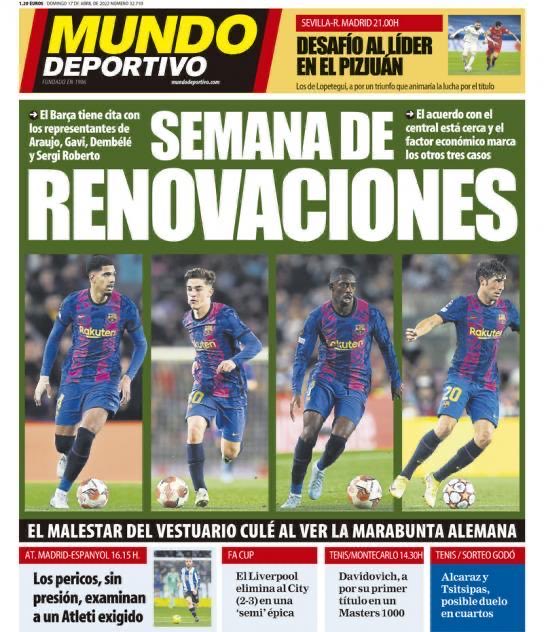 عنونت موندو ديبورتيفو في غلافها بـ أسبوع التجديدات، حيث أوضحت أن برشلونة لديه موعد مع ممثلي أراوخو وجافي وديمبيلي وسيرجي روبرتو.