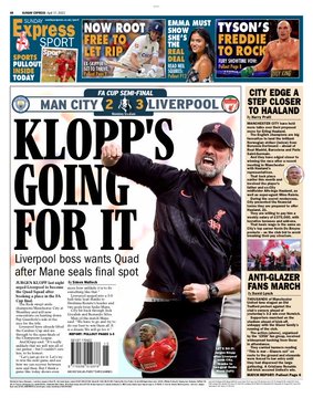 تصدر العنوان ملاحقة كلوب غلاف صحيفة إكسبريس لعدد اليوم، حيث قالت إن مدرب ليفربول يريد الرباعية بعد قيادة ماني للفريق نحو النهائي.