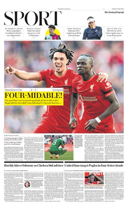 عنونت تيليجراف بـ حلم الرباعية في غلافها، حيث أوضحت أن هدفي ماني تصريح واضح أن حلم الرباعية لليفربول مازال حيًا.