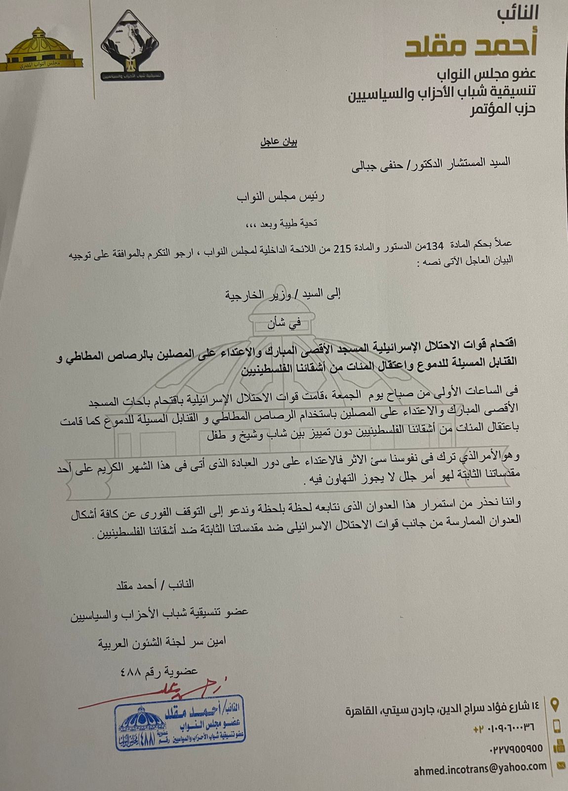 بيان عاجل في البرلمان إلى وزير الخارجية بشأن اقتحام قوات الاحتلال لباحات المسجد الأقصى