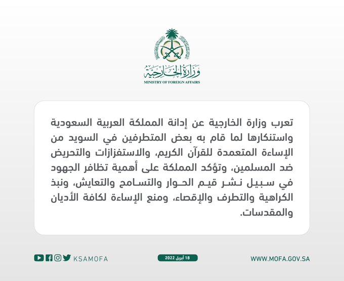 جاء ذلك فيس بيان رسمي نشرته وزارة الخارجية السعودية عبر صفحتها الرسمية على موقع التواصل الاجتماعي تويتر، والذي قالت خلاله، “ أعربت وزارة الخارجية عن إدانة المملكة العربية السعودية واستنكارها لما قام به بعض المتطرفين في السويد من الإساءة المتعمدة للقرآن الكريم، والاستفزازات والتحريض ضد المسلمين”.
