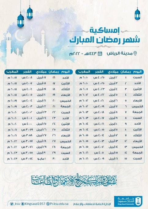 بدأت غرة شهر رمضان 2022 في الرياض مثل مصر وأغلب الدول العربية يوم 2 أبريل 2022 على أن يكمل رمضان عدته كاملا مدة 30 يوما، وتختلف إمساكية رمضان 2022 الرياض العاصمة السعودية، عن إمساكية رمضان 2022 مصر، ومن المقرر أن يفطر سكان مدينة الرياض اليوم السابع عشر من رمضان 2022 في تمام الساعة 6:17 دقيقة بالتوقيت المحلي لهم.