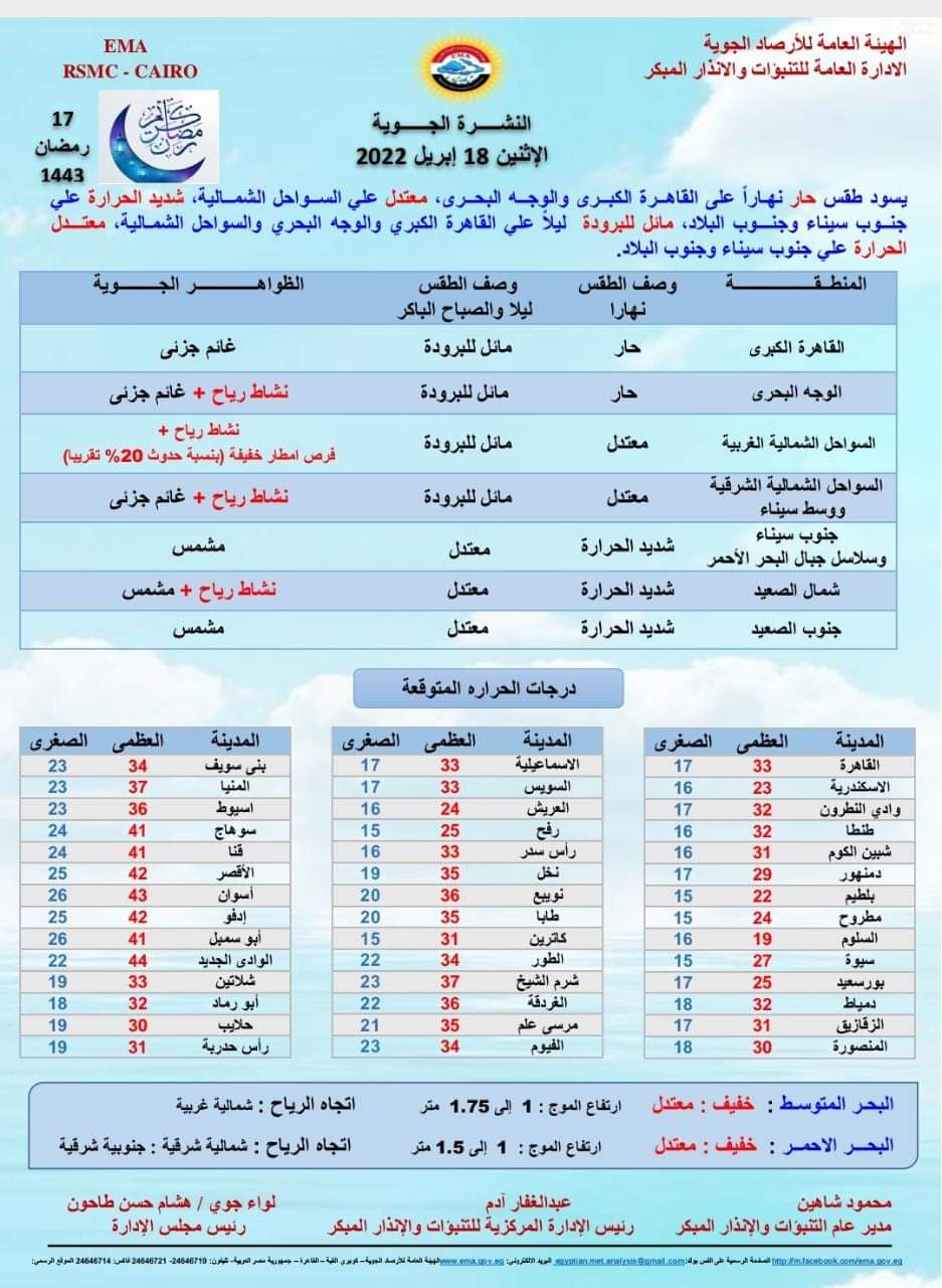 ويسود اليوم طقس حار نهارًا على القاهرة الكبرى والوجه البحري، شديد الحرارة على جنوب سيناء وجنوب البلاد، وطقس مائل للبرودة ليلا، ومعتدل الحرارة على السواحل الشمالية وجنوب سيناء وجنوب البلاد، حسب ما أعلنته الهيئة العامة لـ الأرصاد الجوية عبر صفحتها الرسمية على فيسبوك.