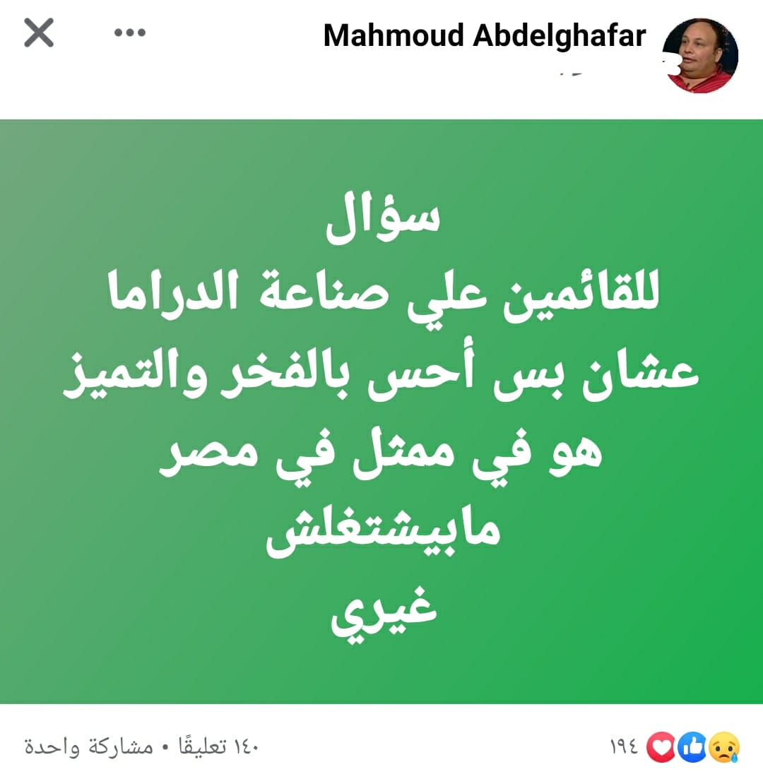 وكتب الفنان محمود عبد الغفار ساخرا من عدم اختياره من القائمين على صُنّاع الدراما في أي عمل فني، قائلا: سؤال للقائمين على صناعة الدراما، علشان بس أحس بالفخر والتميز، هو في ممثل بمصر مبيشتغلش غيري.