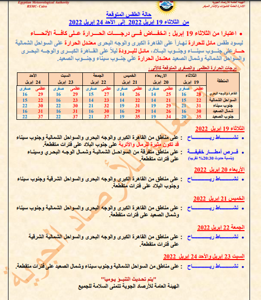 كشفت الهيئة العامة للأرصاد الجوية توقعاتها لحالة الطقس في مصر خلال أسبوع، من يوم الثلاثاء إلى الأحد المقبل الموافق 24 أبريل، وذلك عبر نشرتها الجوية الأسبوعية.