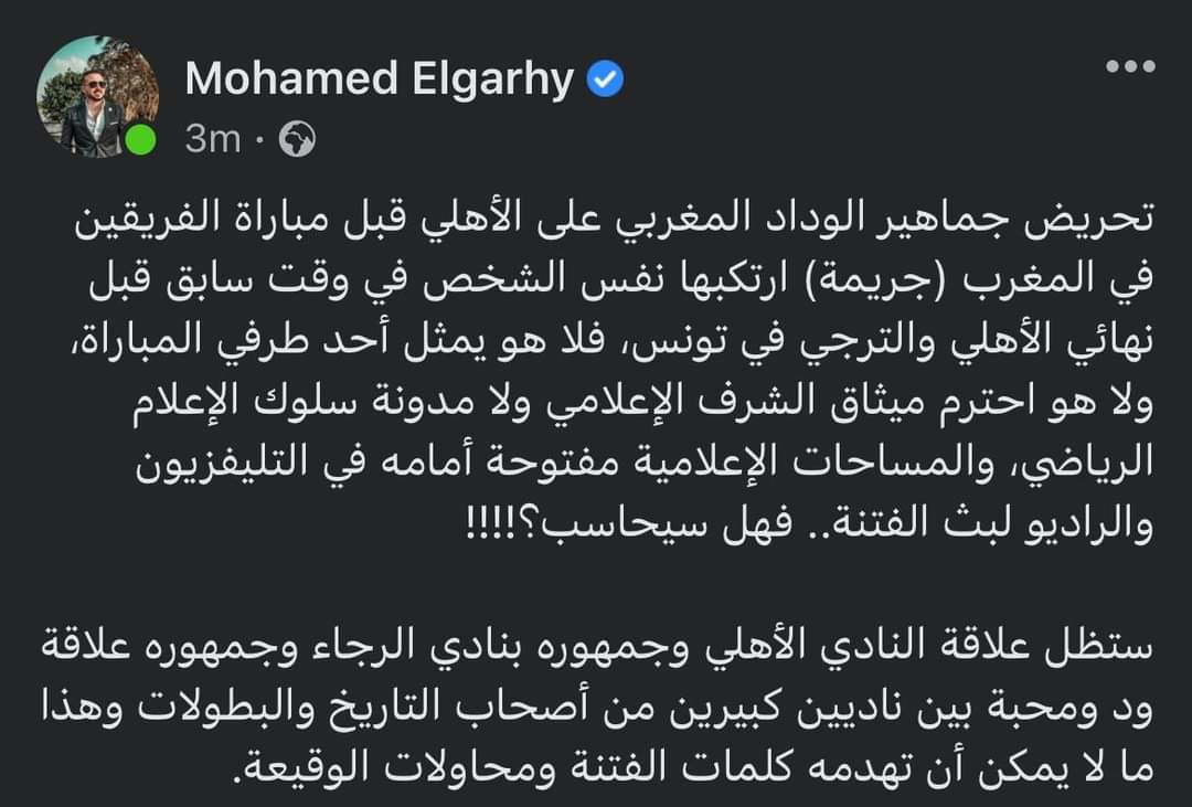 وقال الجارحي عبر حسابه الشخصي علي فيس بوك: تحريض جماهير الرجاء المغربي على الأهلي قبل مباراة الفريقين في المغرب جريمة ارتكبها نفس الشخص في وقت سابق قبل نهائي الأهلي والترجي في تونس، فلا هو يمثل أحد طرفي المباراة، ولا هو احترم ميثاق الشرف الإعلامي ولا مدونة سلوك الإعلام الرياضي، والمساحات الإعلامية مفتوحة أمامه في التليفزيون والراديو لبث الفتنة.. فهل سيحاسب؟!!!!
