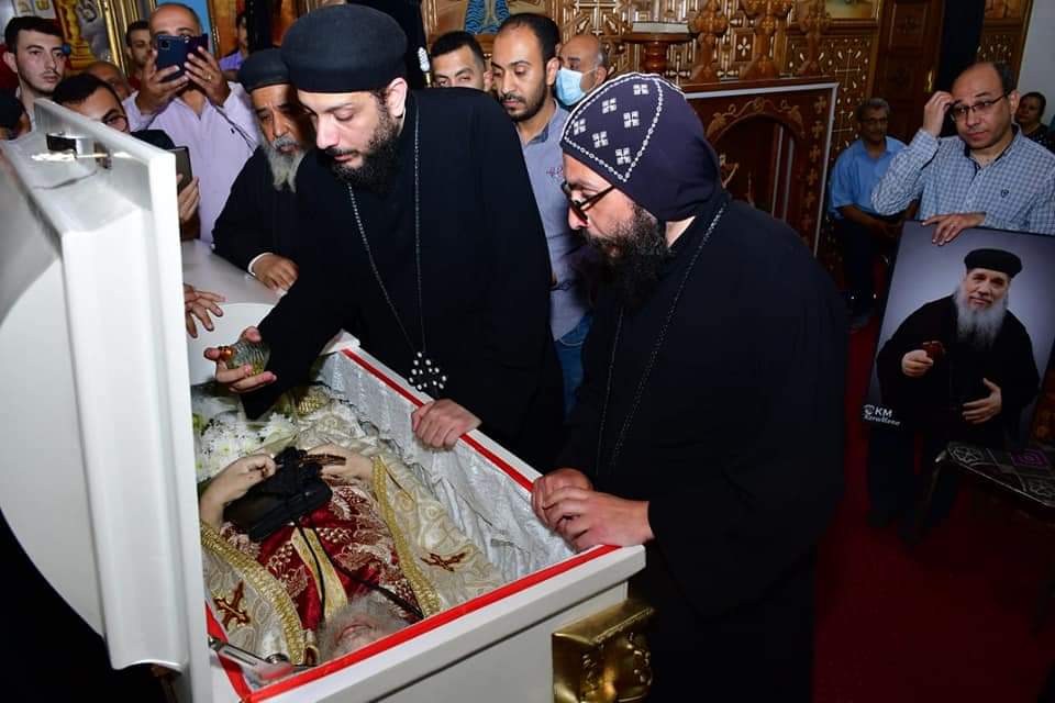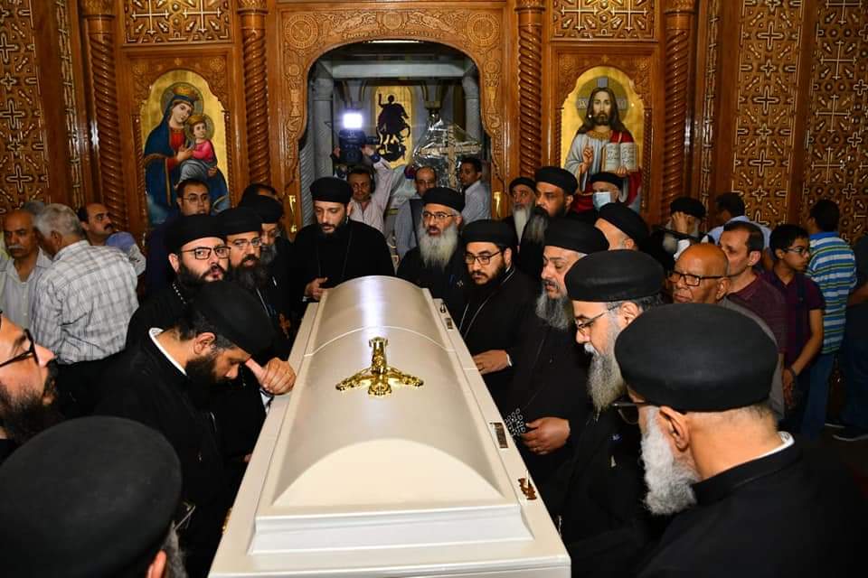 وقد أودع جثمان الأب الراحل في كنيسته، وحضر جزء من صلوات السواعي النهارية ليوم اثنين البصخة، وأتيحت فرصة لأبناء الكنيسة لإلقاء نظرة الوداع عليه، ثم نقل إلى كنيسة الشهيد مارجرجس بسوهاج (مقر المطرانية) حيث أقيمت صلوات تجنيزه الساعة الثانية من بعد ظهر اليوم، ضمن صلوات الساعة الحادية عشرة من يوم اثنين البصخة، بحضور نيافة الأنبا باخوم أسقف الإيبارشية، ومجمع كهنتها، وبعض من كهنة إيبارشيتي إخميم وساقلته، البلينا، وأعداد كبيرة من شعب سوهاج.