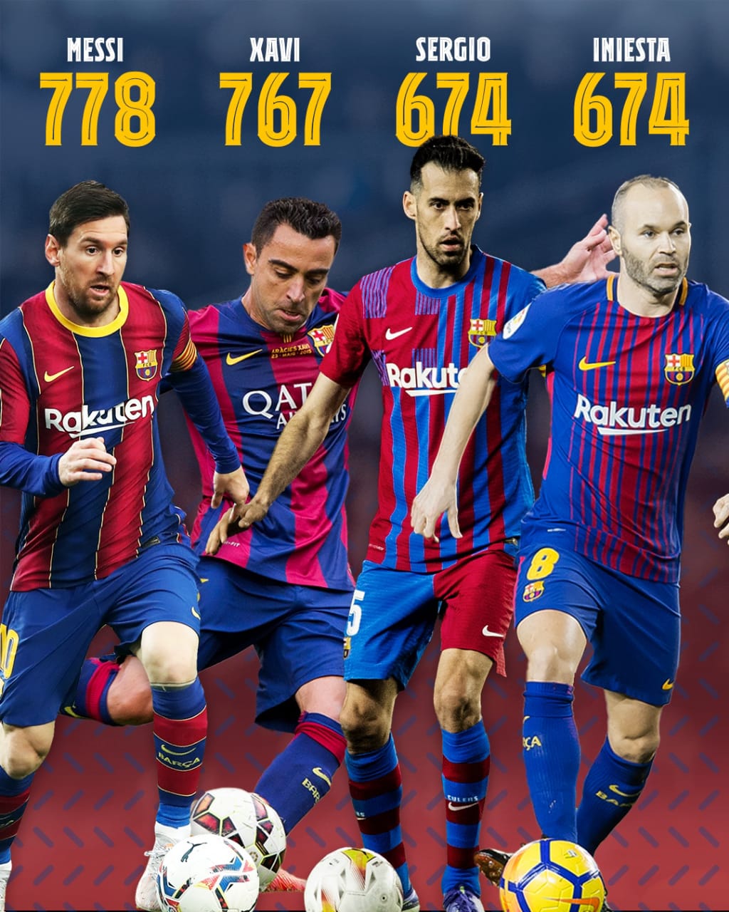 وعادل سيرجيو بوسكيتس رقم نجم خط الوسط أندرياس إنيستا لاعب البلوجرانا السابق، بـ 674 مُباراة مع برشلونة، حيث يتواجد في المركز الأول النجم الأرجنتيني ليونيل ميسي بـ 778 مباراة، ثم يليه تشافي هيرنانديز نجم الفريق السابق والمدير الفني الحالي بـ 767 مباراة.