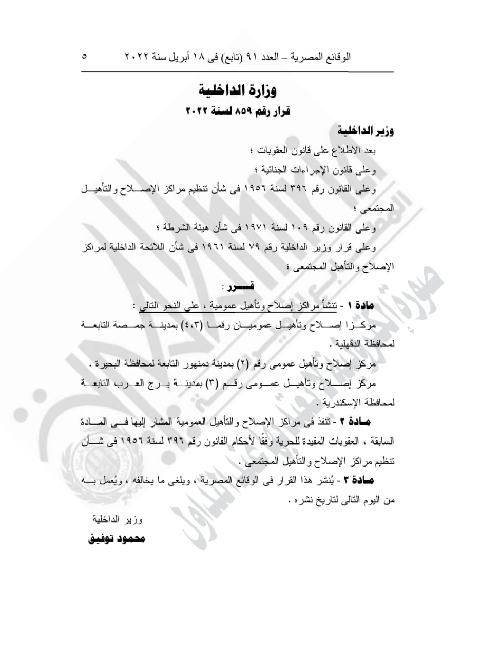 أصدر اللواء محمود توفيق وزير الداخلية، قرارًا رقم 859 لسنة 2022، بشأن تنظيم مركز الإصلاح والتأهيل المجتمعي، إنشاء وتأهيل 3 مراكز بالدقهلية والإسكندرية والبحيرة.