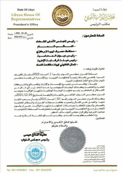 طالب المستشار عقيلة صالح، رئيس مجلس النواب الليبي، جميع المؤسسات والإدارات والمصالح والشركات العامة والخاصة والبعثات الدبلوماسية، بعدم التعامل بأي شكل من الأشكال أو التخاطب باسم حكومة الوحدة الوطنية؛ التي يترأسها عبد الحميد الدبيبة، باعتبارها منتهية ولايتها بموجب قرار مجلس النواب القاضي بانتهاء ولايتها في 24 من ديسمبر 2021.