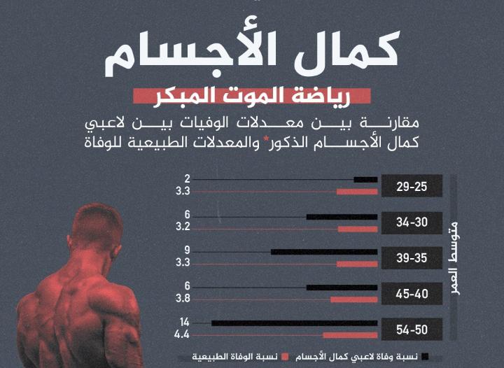وتوضح إحصائيات جديدة أن هناك ارتفاعًا في معدلات الوفيات بين لاعبي كمال الأجسام الذكور، مقارنة بالمعدلات الطبيعية للوفاة، وتشير دراسة جديدة إلى أن هناك 1578 حالة وفاة من لاعبي كمال الأجسام المحترفين المتنافسين بين عامي 1948 إلى 2014، حسب المجلة الطبية جورنال أوف يورولوجي.