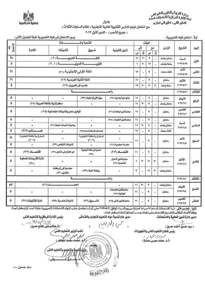 ننشر جدول امتحان دبلوم المدارس الفنية التجارية 2022