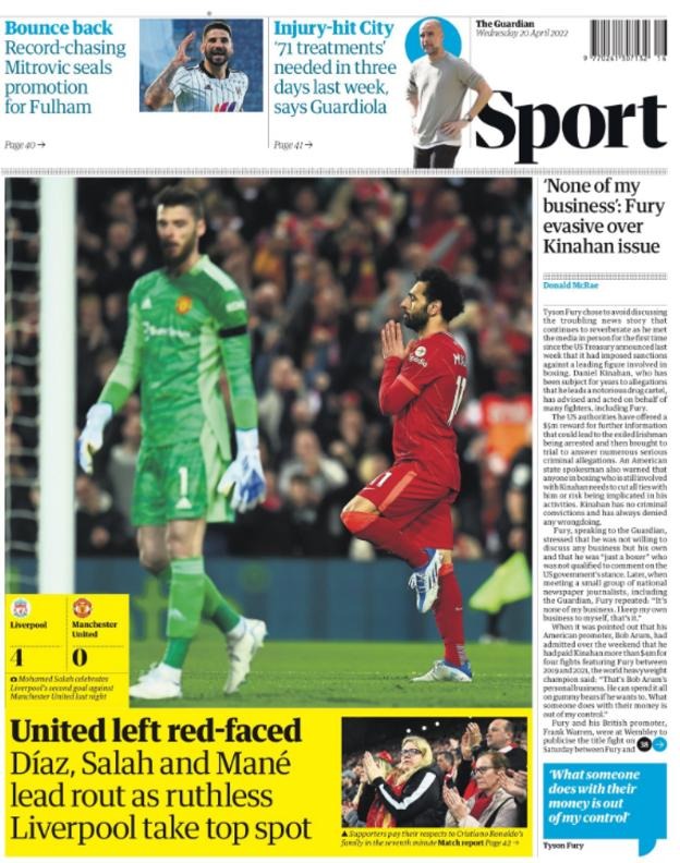 تصدرت اللقطة الأبرز باحتفال محمد صلاح وحسرة هاري ماجواير بعد الهدف الثاني غلاف الصحيفة، وعنونت بـ رباعية غير قابلة للتصديق.