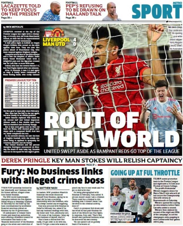 عنونت مترو في غلافها بـ هزيمة هذا العالم.. ليفربول يجتاح يونايتد ويعود إلى الصدارة، كما قالت الصحيفة في غلافها إن محمد صلاح أنهى الهدفين بشكل أكثر من رائع في مرمى دي خيا وعاد للتسجيل بكل ثبات وبثنائية مميزة.