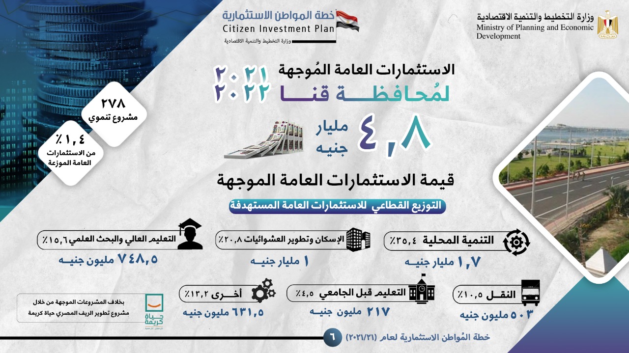التخطيط: 4.8 مليار جنيه استثمارات موجهة لمحافظة قنا بخطة عام 21/2022 | إنفوجراف