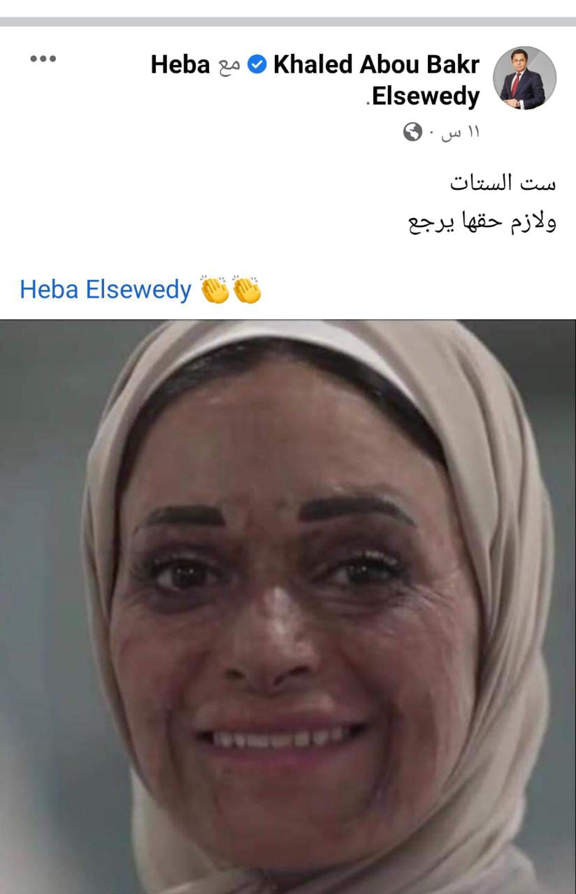وفي سياق متصل، دعّم المحامى الدكتور خالد أبو بكر، مستشار رئيس هيئة قناة السويس للشؤون القانونية والعلاقات الدولية، منال حسني بعدما تعرضت للتنمر، حيث نشر صورتها عبر صفحته الرسمية بموقع التواصل الاجتماعي فيسبوك، مع إشارة لصفحة الدكتورة هبة السويدي، وعلق عليها قائلًا: ست الستات ولازم حقها يرجع.