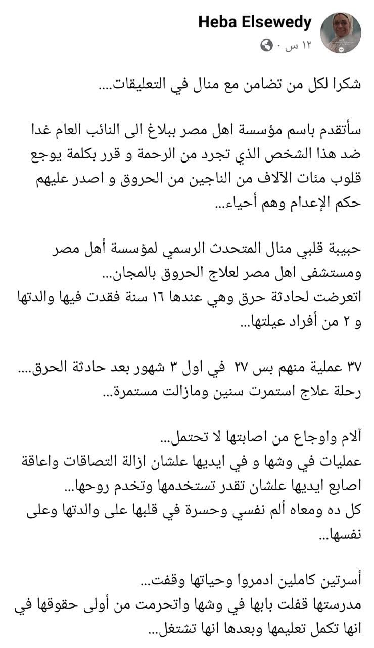 وتابعت السويدي خلال المنشور، بأن منال خضعت لحوالي 37 عملية جراحية، منهم 27 في أول 3 أشهر بعد الحادثة، حيث استمرت رحلة علاجها لأعوام ومازالت مستمرة، مضيفة: آلام من إصابتها لا تُحتمل، عمليات في وشها وإيديها علشان إزالة الالتصاقات، وإعاقة أصابع إيديها عشان تقدر تستخدمها وتخدم روحها، كل ده ومعاه ألم نفسي وحسرة في قلبها على والدتها وعلى نفسها.