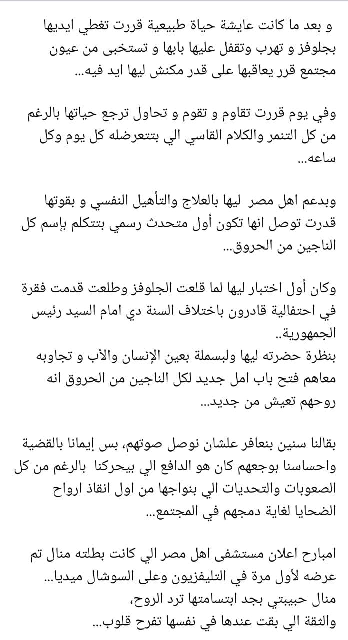 وأرفقت مؤسسة أهل مصر مع المنشور صورة لمنال حسني، وكتبت عليها: وجه كلمة لمنال تدعمها وتشجعها على تكملة مشوارها وتحقيق أحلامها.