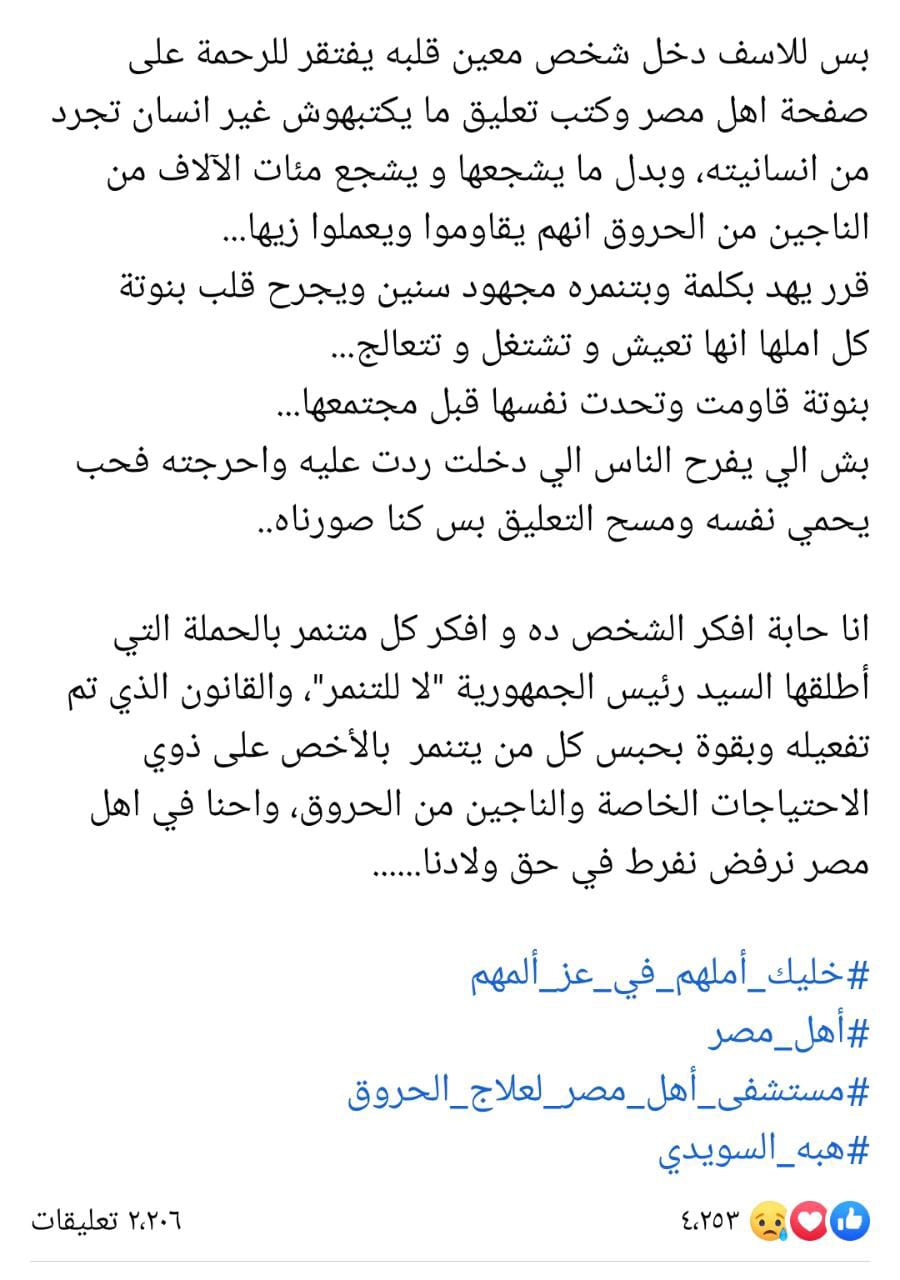غضب واستياء شديد انتشر عبر موقع التواصل الاجتماعي فيس بوك خلال الساعات القليلة الماضية، بعد إساءة وتنمر أحد المتابعين عبر تعليق على منال حسني، إحدى الناجيات من الحروق، وبطلة إعلان مستشفى أهل مصر والمعروض حاليًا.
